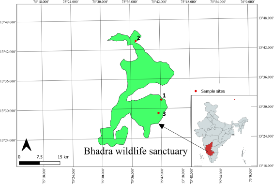 ![]() | Table 1. Location and climatic conditions of the sample site in Bhadra Wildlife Sanctuary. [Click here to view] |