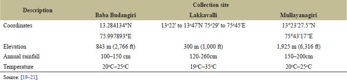 The plant samples were collected in the month of September 2016, in three different locations of Bhadra Wildlife Sanctuary, Western Ghats, Karnataka, i.e., Baba Budangiri, Lakkavalli, and Mullayangiri. The geographical location and its climatic conditions are shown in Figure 1 and Table 1.