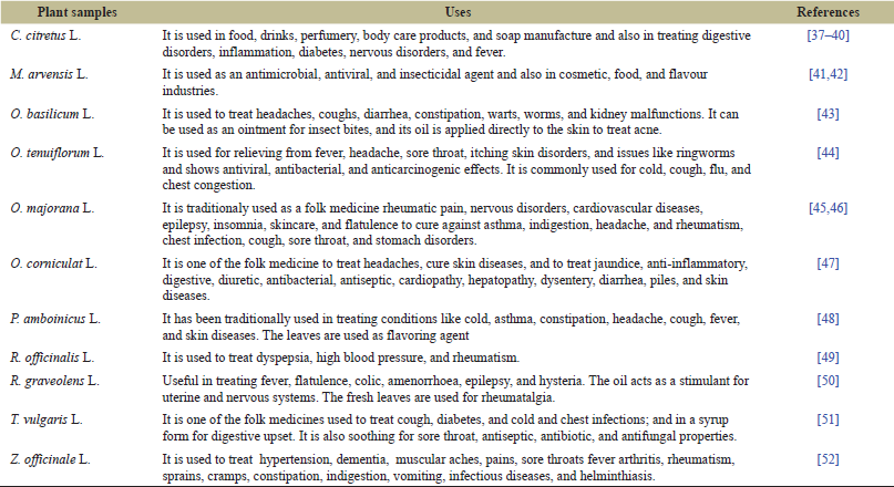 ![]() | Table 2. List of selected aromatic plants collected from Bhadra Wildlife Sanctuary and its medicinal uses. [Click here to view] |