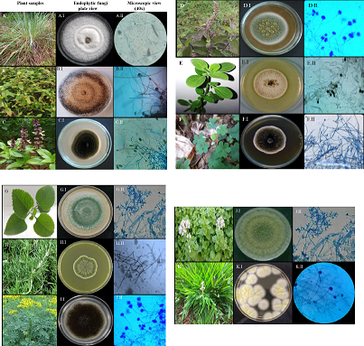 ![]() | Figure 2. Aromatic plant samples collected from different locations of Bhadra Wildlife Sanctuary and endophytic fungi isolated (plate and microscopic view). A C.citretus L. and A.I F. oxysporum; B M. arvensis L. and B.I Rhyzopus sp.; C O. basilicum L. and C.I A. alternate; D O. tenuiflorum L. and D.I P. Crysogenum; E O. majorana L. and E.I Circinella sp.; F O. corniculata L. and F.I Cladosporium sp.; G P. amboinicus L. and G.I Tricoderma sp.; H R. officinalis L. and H.I Cladosporium sp.; I R. graveolens L. and I.I A. niger; J T. vulgaris L. and J.I T. viride; and K Z. officinale L. and K.I A. fumigatus. [Click here to view] |