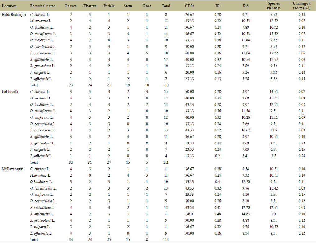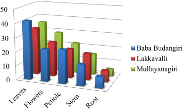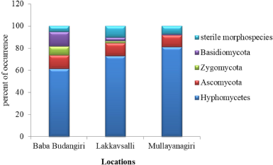 ![]() | Figure 4. Relative isolations of fungal endophytes from different plant parts of aromatic plants collected from Baba Budangiri, Mullayanagiri, and Lakkavalli. [Click here to view] |