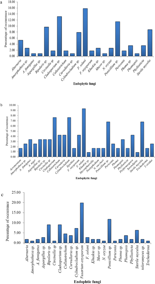 ![]() | Figure 3. The percentage of dominant (D) isolated endophytic fungi from different locations: a, Baba Budangiri; b, Lakkavalli; and c, Mullayanagiri. [Click here to view] |