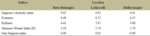 The Shannon–Wiener index indicated that Baba Budangiri region had a higher index value of 3.19. Simpson’s D depicts that Lakkavalli region had higher species diversity with an index value of 0.95. Baba Budangiri and Mullayanagiri regions have similar Simpson’s D of 0.91. These results are also supported by Gini Simpson’s diversity index indicating that plants collected from the Lakkavalli region showed greater fungal diversity when compared to the other two regions. The E and species richness were also compared between different regions and it was found that Lakkavalli region had comparatively higher E (0.72) and species richness (5.87) (Table 4).