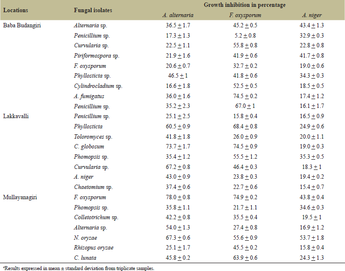 The antifungal activity of the fungal isolates was evaluated for the antagonistic property. A total of 160 endophytic fungi (46.6%) were found active against one or more test pathogens. More than 15% inhibition in radial growth against all the tested pathogens was recorded in 27 (7.8%) isolates (Table 6). The most notable inhibition was demonstrated by C. globosum (PAL3) from Lakkavalli against F. oxysporum, giving 74.5% inhibition in radial growth. Similar work was reported in which, 24 isolates among the 72 endophytic fungi from Cedrus deodara, Pinus roxburgii, and Abies pindrow inhibited 3 or more phytopathogens by at least 50% in dual culture [22].