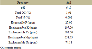 Table 1 presents the initial chemical properties of the soil before the start of the experiment. Soil chemical analyses revealed that it was slightly acidic with moderately low OC, very low N, but high P content. On the other hand, the basic cation concentrations in the soil ranged from low to high. The K and Ca contents were low, there was a high amount of Mg, and it had an optimal Na concentration.