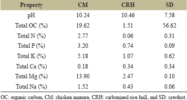 ![]() | Table 2: Chemical characteristics of CM, carbonized rice hull, and sawdust used in the study. [Click here to view] |