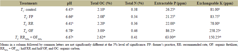 After harvest, soil chemical properties were significantly affected by fertilizer application, except total N (Table 3). The highest increase in soil pH, total OC, extractable P, and exchangeable K has consistently been observed in the OF-treated plots. The increase in soil total OC, available P, and K in the OF treatment was 43%, 229%, and 219%, respectively, over the control plots. Likewise, soil pH in the OF-treated plot increased by 0.33 units relative to the control. Furthermore, plots amended with RR50% + OF50% had significantly higher pH, OC, P, and K than in the FP and RR treatments. Correlation analysis showed that soil OC was positively and very strongly associated with total N (r = 0.93; p = <0.01), extractable P (r = 0.94;p = <0.01), and exchangeable K (r = 0.90; p = <0.01) (Table 4). This indicates that soil nutrient level increases with increasing OC content.