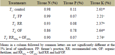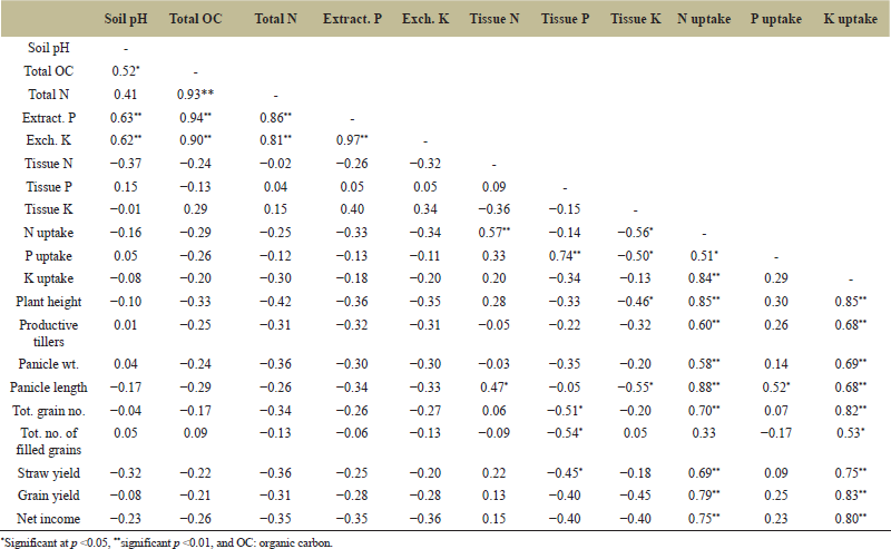 ![]() | Table 5: Means for the tissue N, P, and K content of rice as affected by organic and inorganic fertilizer application. [Click here to view] |