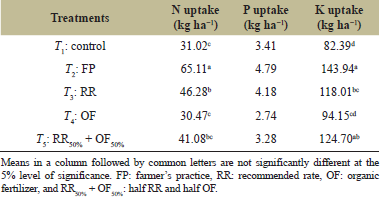 Nutrient uptake measures the total amount of nutrients absorbed by plants per biomass produced. Generally, heavier plants will accumulate more nutrients in their tissues. In the study, the N uptake of rice ranged from 30.47 kg ha−1 to 65.11 kg ha−1 (Table 6). The highest N uptake was recorded in the FP treatment with a 110% increase over the untreated control. This was followed by RR and RR50% + OF50% treatments with 49% and 32% increase, respectively, over the control. The highest N uptake recorded in the FP treatment was due to high application rates of N (159 kg N ha−1). The lowest N accumulation was observed in the sole OF and control treatment. Moreover, correlation analysis showed a positive and moderate linear relationship between N uptake and tissue N concentration (r = 0.57; p = <0.01) and P uptake (r = 0.51; p = <0.05) and a very strongly linear relationship with K uptake (r = 0.84; p = <0.01) (Table 4). Correlation analysis suggested a positive interaction between N, P, and K.