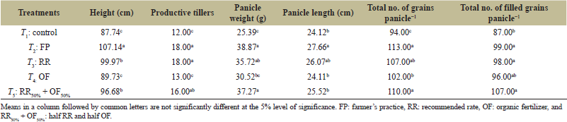 Fertilizer application significantly increased the panicle weight plant−1 and panicle length of rice. Heavier panicles were recorded in the FP, RR50% + OF50%, and RR treatments, almost twice heavier than the panicles produced in the unamended (control) plants (Table 7). Meanwhile, the control and the organic amended (OF) plants had comparable panicle weights and weighed lighter than other fertilizer treatments.
