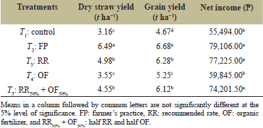 Furthermore, the combined application of organic and inorganic fertilizer increased grain yield production in rice. This finding agrees with the study of Moe et al. [27], who reported the highest yield in rice with applied half chemical fertilizer and half organic manure. Chemical fertilizers provide a readily soluble nutrient to plants, while OF's supply a more balanced mix of macro- and micronutrients. Similar findings were also reported by Rajput et al. [30], who reported a higher grain yield of rice with fertilizer application based on soil test value. Interestingly, the highest yield obtained in our study, which is 6.68 t ha−1, was higher by 108% over the average yield (3.21 t ha−1) reported in the Caraga Region [31] and 42% higher than the average yield (4.7 t ha−1) reported using this variety. However, the present study only covers one cropping season. Hence, further study is needed to validate our result.
