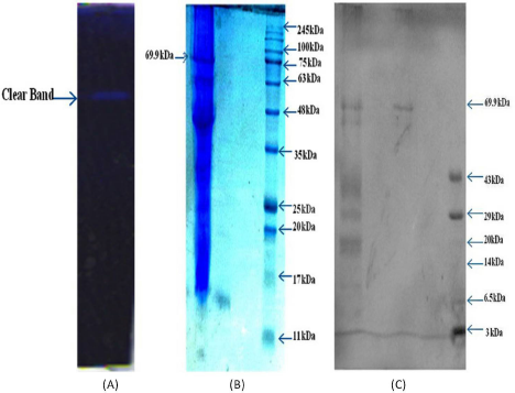The proteolytic activity of protease was also confirmed by gelatin zymography in which gelatin was degraded by protease and a clear band appeared against the dark blue background.