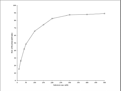 The effect of the increasing concentration of substrate on the rate of reaction was monitored by employing casein as substrate in 0.05 mM sodium phosphate buffer of pH 7.5 at 37°C. The effect of substrate concentration was studied with casein in the range of 1–500 μM and 10 μg of protease.