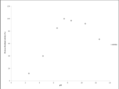 The effect of the pH of the buffer on the purified protease activity was examined to determine the optimum pH of the protease. The proteolytic activity of protease was examined in the pH range from 2.5 to 12.5 to determine the optimum pH. The buffers used were 0.05 M glycine-HCl (pH 2.5), 0.05 M sodium citrate (pH 4.5), 0.05 M sodium phosphate (pH 6.5), 0.05 M sodium phosphate (pH 7.5), 0.05 M Tris-HCl (pH 9.5), 0.05 M Tris-Base (pH 10.5), and 0.05 M glycine-NaOH (pH 12.5). Protease activity was monitored with BAPNA at 410 nm and each assay was carried out in triplicate.