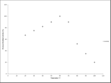 ![]() | Figure 7: Effects of temperature on the protease activity of C. tetragonoloba. 15 ug of protease was used to determine the activity. The activity of the protease at 60°C was determined to be 100%. [Click here to view] |