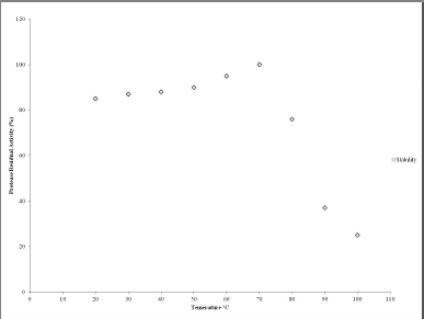 The effect of temperature on the purified protease activity was examined to determine the optimum temperature of the protease. The protease activity was examined at different temperatures ranging from 20°C to 100°C with the 10 mM buffer. Protease activity was monitored with BAPNA at 410 nm, and each assay was carried out in triplicate. The highest activity of the protease was considered 100%.