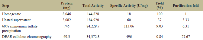 ![]() | Table 1: Summary of protease purification from the seeds of C. tetragonoloba. [Click here to view] |