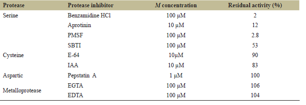 ![]() | Table 2: Effects of various protease inhibitors on protease activity. [Click here to view] |