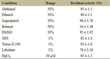 The stability of purified protease was monitored in the presence of a solvent and surfactants. The purified protease was mixed with different concentrations of the solvent. The mixture was incubated for 24 hours with constant mixing on an orbital shaker. The reaction was initiated by adding a substrate at 37°C. The control activity is considered as 100% that is devoid of solvents or surfactants. The results were expressed as percent residual activity.