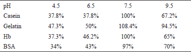 ![]() | Table 4: Relative activities of protease with different substrates at different pH. The activity of protease with casein was considered 100% activity and the relative activities with the other substrate were represented in percentage relative activity to that of casein. [Click here to view] |