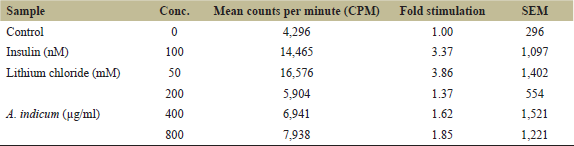 ![]() | Table 3: Quantification of insulin release in RIN-5f cells treated with A. indicum. [Click here to view] |