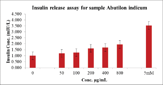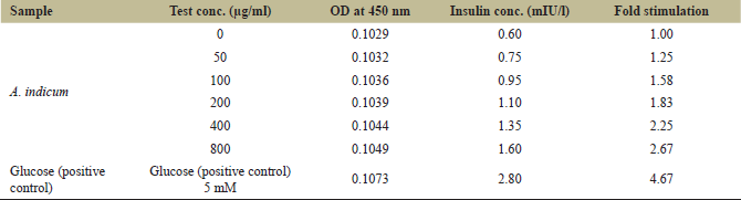 ![]() | Figure 3: Representation of the quantification of insulin release in RIN-5f cells treated with A. indicum. [Click here to view] |
