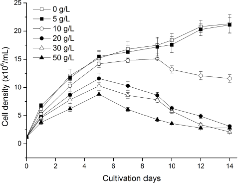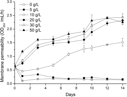 Cell membrane permeability in treatment of 0 and 5 g/l showed a stable trend and did not express a significant difference between them. However, the variation in other treatments quickly increased, and the longer the cultivation days were, the more significant the differences were (Fig. 3). Cell membrane permeability in treatments of 10, 20, 30, and 50 g/l increased 9.3, 14.7, 15.5, and 14.2 times than that of control treatment on the 14th day, respectively. These results indicated that marigold leaf extract higher than 5 g/l damages the cell membrane structure and increases the permeability of cell membrane, thus inhibiting algal growth.