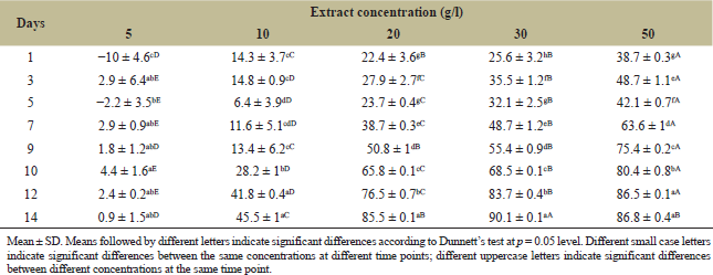 ![]() | Table 1: Influence of different concentrations of marigold leaf extracts on cell growth inhibition rate (%) of C. vulgaris. [Click here to view] |