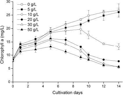 Chlorophyll was closely related to cell growth and photosynthesis. The chlorophyll a content decreased after adding marigold leaf extract, and that in treatments of 10, 20, 30, and 50 g/l decreased by 50.6%, 71.2%, 79.4%, and 78.7%, respectively, compared to control treatment on the 14th day (Fig. 2). With the extension of culture time, chlorophyll a content in treatments differed significantly from that of control treatment. However, the chlorophyll a content in treatment of 5 g/l stayed an increasing trend and no significant difference with that of control treatment, indicating that low concentration of marigold leaf extract was not enough to damage cell photosynthesis. Chlorophyll a content in other treatments increased at first day and then decreased; especially solution color in treatments of 20, 30, and 50 g/l from dark green turned yellow significantly compared to other treatments, indicating that cells have an ability to self-repair and adapt to external stress environment in the initial stage, and this self-repair ability would be disabled by an overdose of allelochemicals [2].