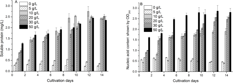 Soluble protein content in treatments 0 and 5 g/l showed a downward trend, while that in other treatments showed an upward trend, and the higher the concentration of extract and the longer the cultivation time, the higher the content of extracellular soluble protein, indicating that high concentration of marigold leaf extract and long existence would seriously damage cell structure and increase cell membrane permeability resulting in the increase of leaked soluble protein content, even resulting in the death of the algal cell (Fig. 4A). The variation pattern of nucleic acid content was similar to that of soluble protein content. The contents of soluble protein and nucleic acid in high doses of treatments (20, 30, and 50 g/l) in the last day were both slightly decreased, which may be related to low cell density and the decrease of synthesis ability of residual algal cells (Fig. 4B).