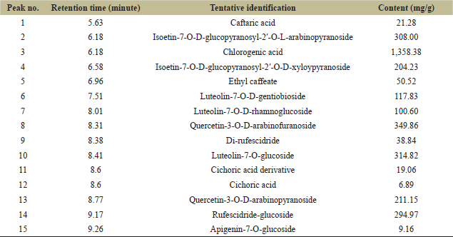 ![]() | Table 2: Ultraperformance liquid chromatography determination result for marigold leaf extract. [Click here to view] |