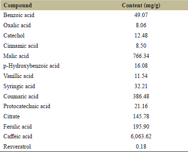 ![]() | Table 3: Ultraperformance liquid chromatography determination result for phenolic acid compounds. [Click here to view] |
