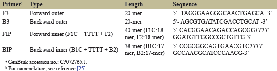 ![]() | Table 1: Sequence of LAMP primers used for specific amplification of the sdaA genea of M. tuberculosis. [Click here to view] |