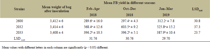 Table 2: Average FB yield (g/bag ± standard error) from three seasons of cultivation of P. eryngii.