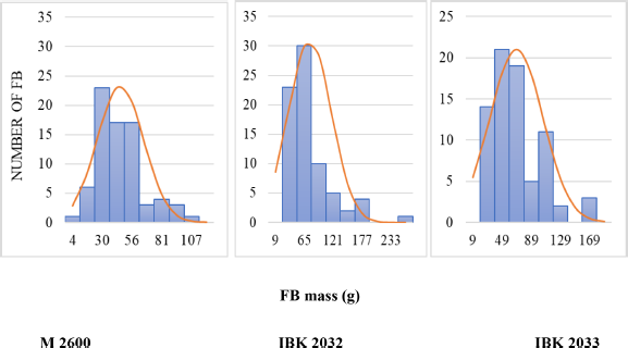 Seventy-five FBs were collected per strain and analyzed for variations in individual FB weight. In strain 2600, 54 out of 75 FBs had weights that ranged between 25 and 45 g, indicating a tight peak shown in Figure 3. However, strains 2032 and 2033 gave FBs with higher weights and a wider spread of FB weight across the spectrum. For strains 2032 and 2033, the distribution of values in samples had significant right-sided asymmetry, and descriptive statistical analysis indicated coefficients of 1.73 and 1.31, respectively. The estimation of FBs’ weight in strain 2600 showed the smallest dispersion of results from average and a lower sample asymmetry coefficient of 1.09.