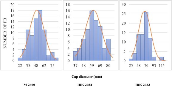 Figure 5: Variations and distribution of FB cap diameter (mm) among P. eryngii strains.