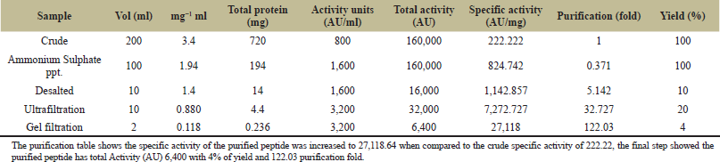 The CFS showed a specific activity of 222.222 with a 160,000 AU and as the purification step was carried out, gradually specific activity increased to 7,272.727 with 20% yield and 32,000 AU. In the final step of purification, the total peptide content of 0.23 mg showed 6,400 AU with a vast increase in specific activity of 27,118 with maximum of 4% yield. As reported by Sabo et al. [19], the AU 3,200 with yield of 2% is quite less when compared with this present work.