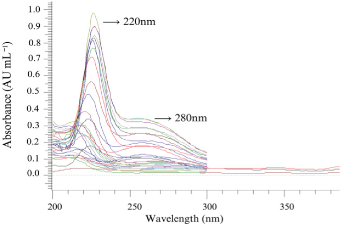 Initially, the crude CFS containing the peptide of interest was analyzed using UV Visible spectrophotometer. The spectrum obtained given an overview idea of the peptides of interest present in the crude supernatant. All amino acids absorb at 200–220 nm due to the C=O group. But, high density of spectrum at 220 nm, suggest the presence of peptide bond (amide) which has given absorbance. It can also be inferred as, the aromatic amino acid (Tyr, Phe, and Trp), absorbed UV with two different peaks. The peak at ~270–280 nm is due to the conjugation system of the aromatic ring and the absorbance peak at lower wavelengths is attributed to carboxylic acid moiety of the amino acid. However, the presence of disulfide bridges (also a result of oxidation) may have showed a weak extinction factor at 280 nm.