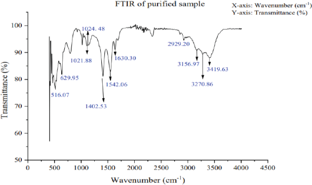 Generally, in this range of 3,300–3,500 cm−1, the wavelength shows a NH stretch. Greater than 3,400 cm−1, at higher wavelength, an asymmetric stretch of (R-NH2) wavelength generally can be found. The presence of a peak at 3,419.63 cm−1 depicts a presence of amide stretch as well. Further few peaks can be seen in the fingerprint region, below 1,500 cm−1. The 1,402.53 cm−1 wavelength reveals OH bend.