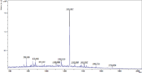 ![]() | Figure 4. MS MALDI analysis showed a major peak in 1,252.607 m/z. [Click here to view] |