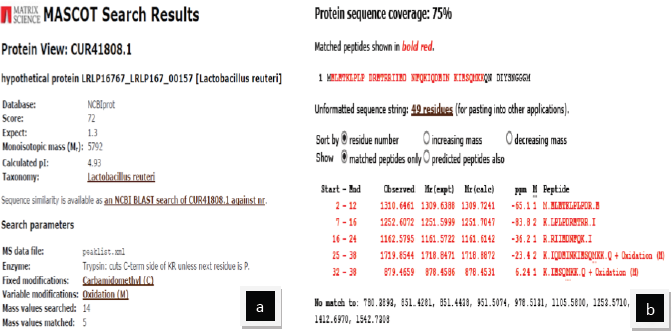 ![]() | Figure 5. a, b: Mascot result showed the best match with the protein sequence of hypothetical protein of L. reuteri. As per the mascot score histogram, protein score ≥75% are significant. Sequence similarity is available as an NCBI BLAST search of CUR41808.1 against nr. ELETKLPLP DRETRRIIED NFQKIQDEIN KIESQMKK. [Click here to view] |