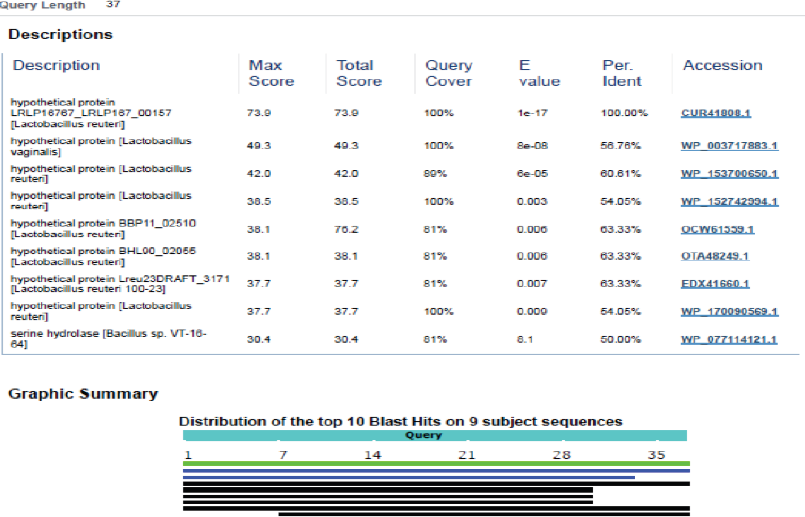 Figure 5(a) and (b) confirms that the peptide showed no exact similarity with the already discovered protein, peptide or even with any type of bacteriocin as shown in Figure 6 using BLAST analysis. The peptide showed 75% sequence similarity with the hypothetical protein of L. reuteri (p < 0.5). The partial protein sequence, were aligned using BLAST tools. Hence, it is the first report of this kind of peptide that was extracted and successfully purified from L. casei.