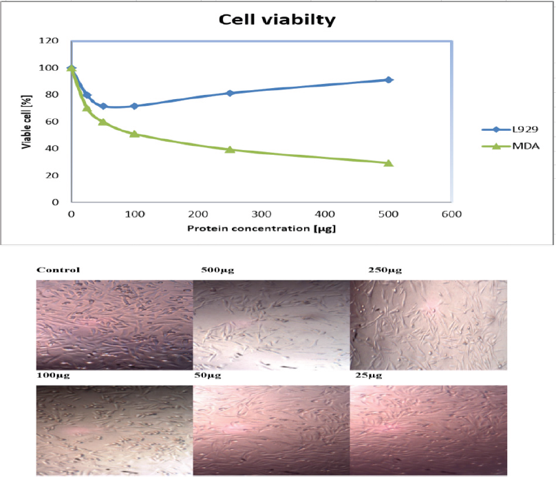 The cell viability (%) were plotted against peptide concentration (μg/ml) as shown in Figure 7(a). Blue line indicates Normal cell line L929 and green line indicates triple negative breast cancer cell line MDA-MB-231. In Figure 7(b) the MTT assay revealed a visible death of the cancer cells with the increase in sample concentration. The cells have been treated for 24 hours with the different concentration of sample, before measuring the cell viability at 570 nm.