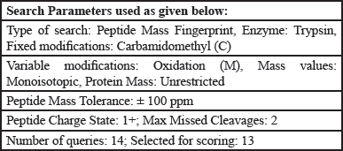 The peptide of interest after trypsinization was directly subjected for the analysis by MS MALDI (BRUKER Ultra flex III MALDI TOF TOF). The sequence was obtained from mascot search and the sequence homology was performed using basic local alignment search tool (BLAST).