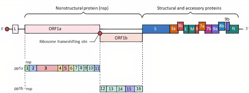 The organization of the viral RNA genome is: 5′-L-UTRs-polumerase-Spike-Env-Membrane-Nucleocapsid-3′UTR-poly(A) [3]. In addition to 4 SPs, the genome codes for 16 NSPs (NSP 1-16), and 9 other accessory proteins [17]. Major NSPs are 3, 5, 12, and 13 shown in Figure 1.