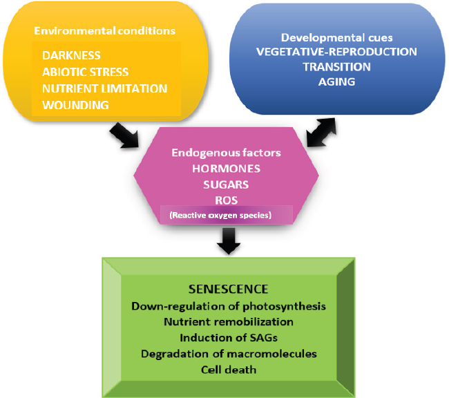 Senescence process is genetically regulated which involves significant changes in the pattern of expression of genes leading to cell degradation and reallocation of resulting products to the newly developed organs. Several senescence-associated genes, encode enzymes that participate in protein degradation and emphasize the importance of nitrogen recycling. In several species, mutants that show delayed leaf senescence have been identified and are very useful in the study of cell maturation and cell death. All these mutants maintain the color of leaves for a prolonged period of time. Functional mutants which are combined with a delay in senescence and metabolic ability preservation are conveniently distinguished from those that maintain green color but have the behavior of natural aging. The progression and initiation of leaf senescence process is correlated with environmental factors as well as developmental cues (Fig. 1). In fact, senescence may be caused by darkness, abiotic stresses, and microorganisms in otherwise young leaves [5].