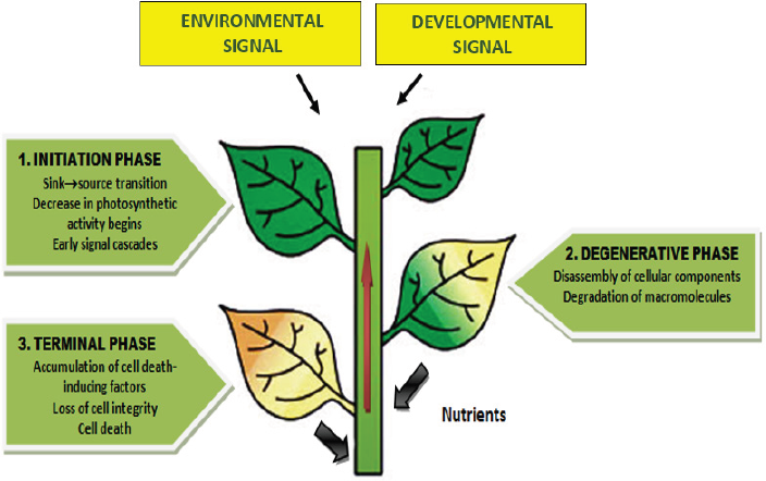 The onset of senescence in the leaves is caused by internal or external causes, such as plant age, or exposure to prolonged darkness, high temperature, or other biotic stressors. During leaf senescence, highly sequential changes occur, with emphasis on structure, gene expression, and metabolism, which are now known as three stages: initiation, reorganization, and termination [11]. However, the mechanisms of initiation can vary under different conditions. Processes of degradation and disassembly occur during degeneration while cell death characterizes termination phase [12].