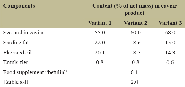 To obtain the product, sea urchin caviar and additional components were used according to the composition indicated in Table 1. Three versions of recipes for caviar products were prepared (1, 2, and 3), which differed in the ratio of the main components.