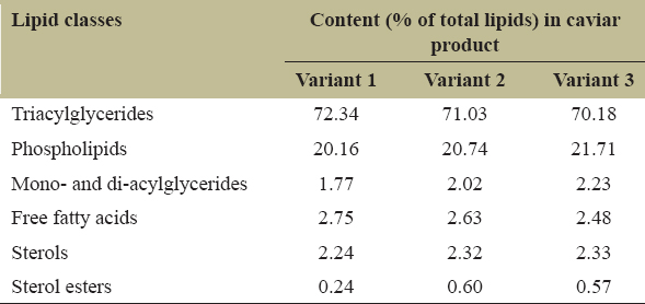| Lipid classes | Content (% of total lipids) in caviar product | ||