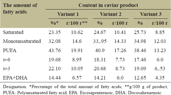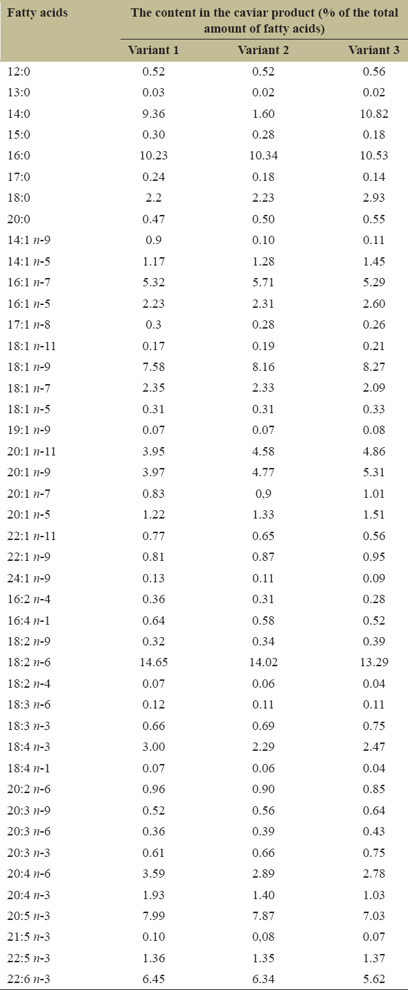The study’s results of individual fatty acids in lipids of caviar products [Table 4] showed that, in all variants products, the group of PUFAs prevailed [Table 5].